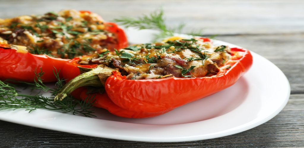 - With a spoon, fill the peppers, to the brim but not over. Arrange in a baking dish, drizzle with Extra Virgin olive oil and sprinkle with the remaining bread crumbs. Bake at 420° F for 20 minutes, serve hot.